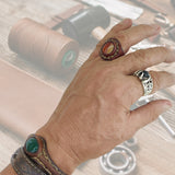 Handcrafted Vegetal Brown Leather Ring with Red Agate Stone with White Stripes Setting-Gift Unisex Leather Fashion Jewelry Band