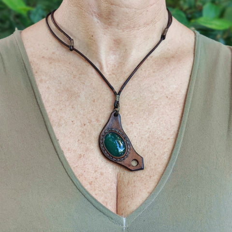 Bohemian Unique Handcrafted Vegetal Brown Leather Necklace with Green Agate Stone-Lifestyle Unique Gift Unisex Fashion Leather Jewelry.