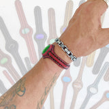 Each bracelet is made adjustable with a flexible copper insert and finished with hand stitching.